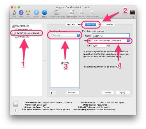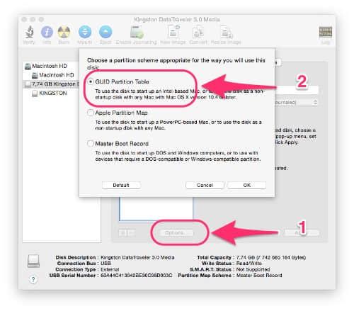 在我们开始真正格式化 USB 盘之前这是唯一一件要做的操作。点击在右边面板的选项按纽,要确保分区的模式是 GUID 分区表形式的。
