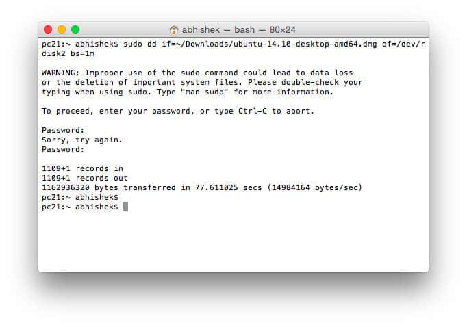 sudo dd if=~/Downloads/ubuntu-14.10-desktop-amd64.dmg of=/dev/rdisk2 bs=1m