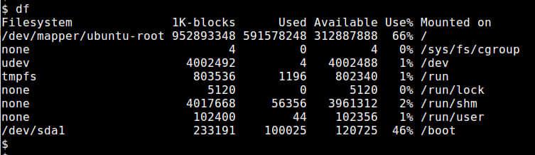 Filesystem Type 1K-blocks Used Available Use% Mounted on /dev/mapper/ubuntu-root ext4 952893348 591583292 312882844 66% / none tmpfs 4 0 4 0% /sys/fs/cgroup udev devtmpfs 4002492 4 4002488 1% /dev tmpfs tmpfs 803536 1196 802340 1% /run none tmpfs 5120 0 5120 0% /run/lock none tmpfs 4017668 60176 3957492 2% /run/shm none tmpfs 102400 48 102352 1% /run/user /dev/sda1 ext2 233191 100025 120725 46% /boot