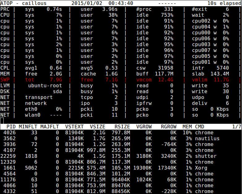 atop命令是用于终端环境的基于ncurses的交互式的系统和进程监测工具。它展示了动态更新的系统资源摘要(CPU, 内存, 网络, 输入/输出, 内核),并且用醒目的颜色把系统高负载的部分以警告信息标注出来。它同样提供了类似于top的线程(或用户)资源使用视图,因此系统管理员可以找到哪个进程或者用户导致的系统负载。内存统计报告包括了总计/闲置内存,缓存的/缓冲的内存和已提交的虚拟内存。