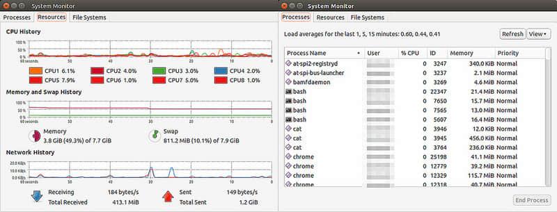 GNOME System Monitor 是一个图形界面应用,它展示了包括CPU,内存,交换区和网络在内的系统资源使用率的较近历史信息。它同时也可以提供一个带有CPU和内存使用情况的进程视图。