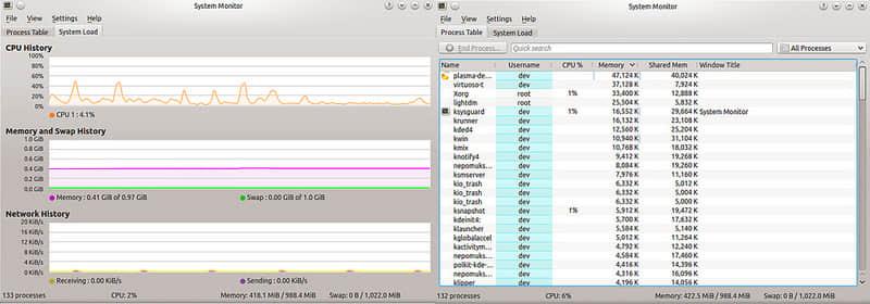 就像GNOME桌面拥有GNOME System Monitor一样,KDE桌面也有它自己的对口应用:KDE System Monitor。这个工具的功能与GNOME版本极其相似,也就是说,它同样展示了一个关于系统资源使用情况,以及带有每个进程的CPU/内存消耗情况的实时历史记录。