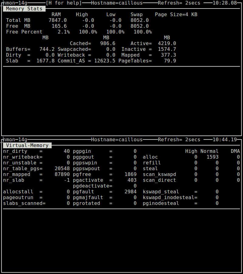 nmon工具是一个基于ncurses系统基准测试工具,它能够以交互方式监测CPU、内存、磁盘I/O、内核、文件系统以及网络资源。对于内存使用状况而言,它能够展示像总计/闲置内存、交换区、缓冲的/缓存的内存,虚拟内存页面换入换出的统计,所有这些都是实时的。