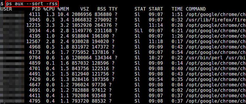 ps命令能够实时展示每个进程的内存使用状况。内存使用报告里包括了 %MEM (物理内存使用百分比), VSZ (虚拟内存使用总量), 和 RSS (物理内存使用总量)。你可以使用“--sort”选项来对进程列表排序。例如,按照RSS降序排序:
