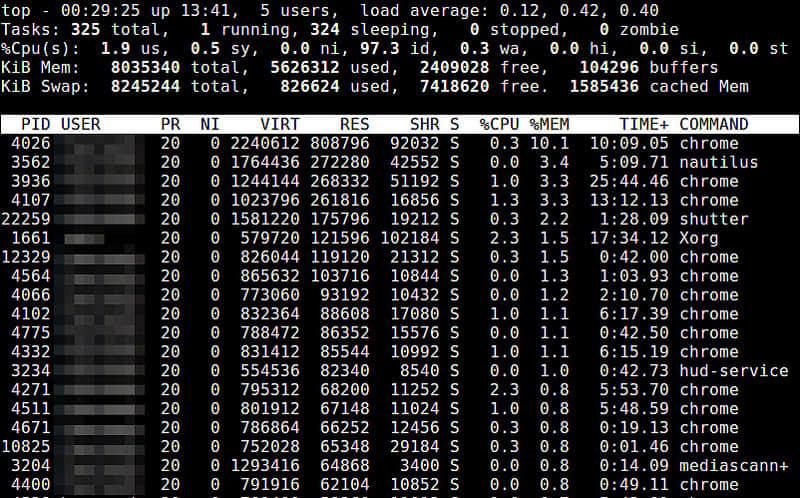 top命令提供了一个运行中进程的实时视图,以及特定进程的各种资源使用统计信息。与内存相关的信息包括 %MEM (内存使用率), VIRT (虚拟内存使用总量), SWAP (换出的虚拟内存使用量), CODE (分配给代码执行的物理内存数量), DATA (分配给非执行的数据的物理内存数量), RES (物理内存使用总量; CODE+DATA), 和 SHR (有可能与其他进程共享的内存数量)。你能够基于内存使用情况或者大小对进程列表进行排序。