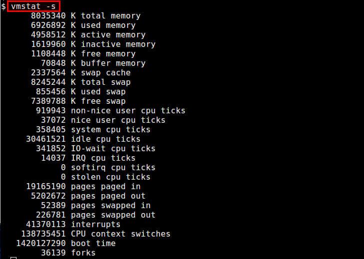 vmstat命令行工具显示涵盖了CPU、内存、中断和磁盘I/O在内的各种系统活动的瞬时和平均统计数据。对于内存信息而言,命令不仅仅展示了物理内存使用情况(例如总计/已使用内存和缓冲的/缓存的内存),还同样展示了虚拟内存统计数据(例如,内存页的换入/换出,虚拟内存页的换入/换出)