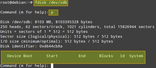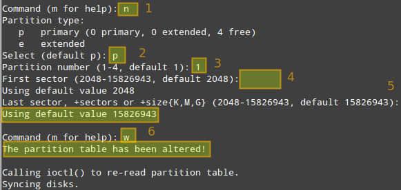 磁盘上没有分区,所以我们使用命令 ['n'] 创建一个主分区['p'], 分配分区号为['1'] 并且指定大小。你可以按回车使用默认值,或者输入一个你想设置的值。如下图:
