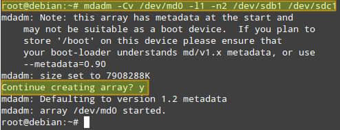 # mdadm --create --verbose /dev/md0 --level=1 --raid-devices=2 /dev/sdb1 /dev/sdc1