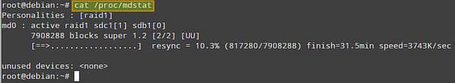 # mdadm -Cv /dev/md0 -l1 -n2 /dev/sdb1 /dev/sdc1