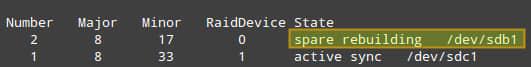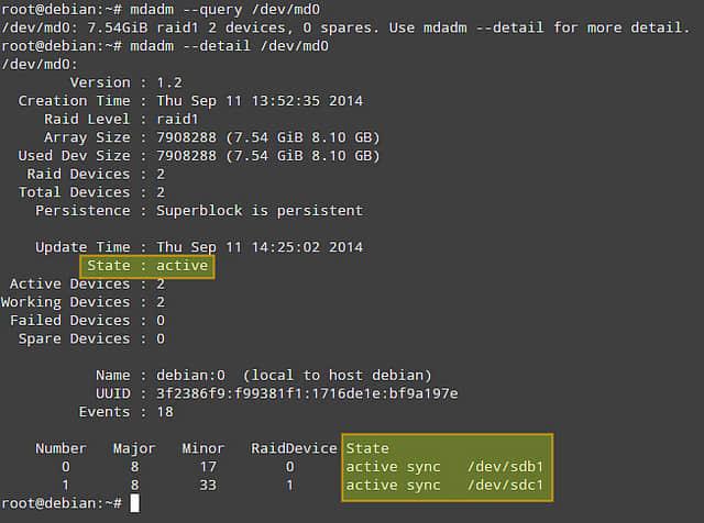 'mdadm -D'命令提供的信息中,最重要就是阵列状态类。激活状态说明阵列正在进行读写操作。其他几个状态分别为:完成(读写完成)、降级(有一块磁盘失效或丢失)或者恢复中(一张新盘已插入,系统正在写入数据)。这几个状态涵盖了大多数情况。