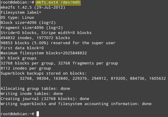 下一步就是格式化阵列了,本例中使用ext4格式: