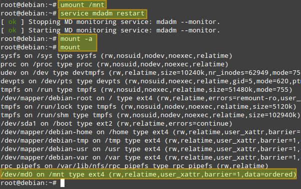 # umount /mnt # service mdadm restart (on Debian, Ubuntu or Linux Mint) or systemctl restart mdmonitor (on Fedora, CentOS/RHEL7) or service mdmonitor restart (on CentOS/RHEL6) # mount -a