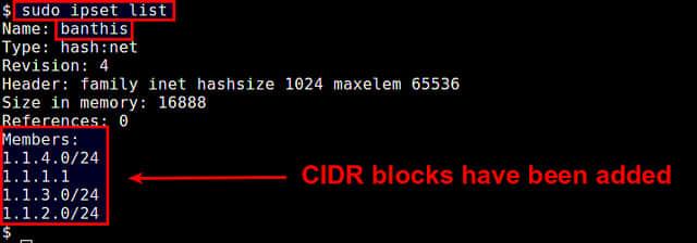 $ sudo ipset add banthis 1.1.1.1/32 $ sudo ipset add banthis 1.1.2.0/24 $ sudo ipset add banthis 1.1.3.0/24 $ sudo ipset add banthis 1.1.4.10/24