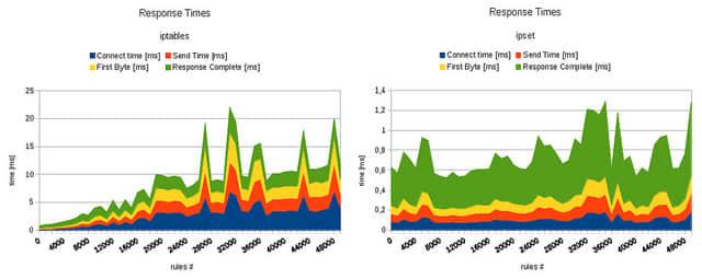 这篇文章中,我描述了你该如何用强大的ipset来屏蔽不想要的IP地址。同时结合了第三方工具iblocklist2ipset,这样你就可以流畅地维护你的IP屏蔽列表了。那些对ipset的性能提升好奇的人,下图显示了iptables在使用和不使用ipset的基准测试结果(注意时间坐标轴)。