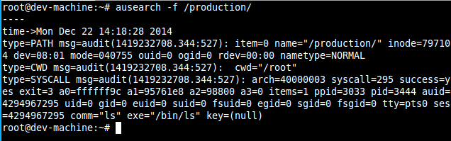 下一步,使用root账户的ls命令列出 /production/ 下的文件信息。再次使用ausearch后,将会显示一些信息。