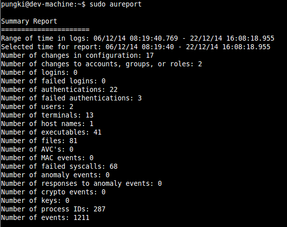 生成审计报告,我们可以使用aureport工具。不带参数运行的话,可以生成审计活动的概述。