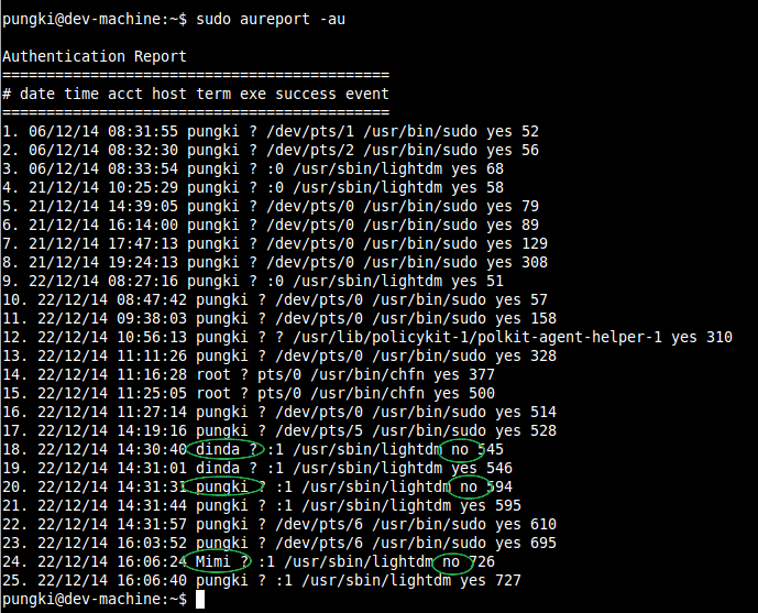 上图可以看出有 3 次授权失败。 使用aureport,我们可以深入查看这些信息。