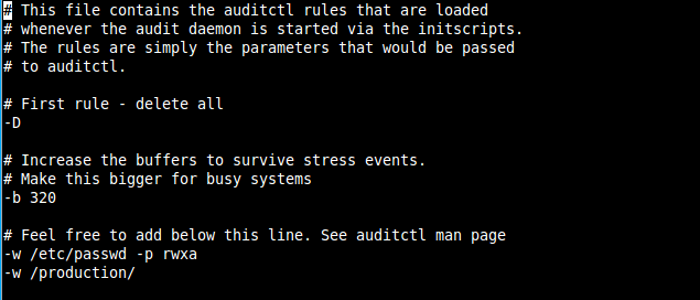 现在,如果确信这些规则可以正常工作,我们可以将其添加到/etc/audit/audit.rules中使得规则永久有效。以下介绍如何将他们添加到/etc/audit/audit.rules中去。