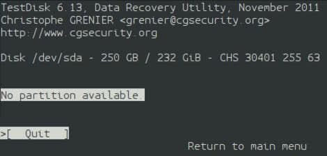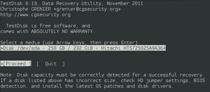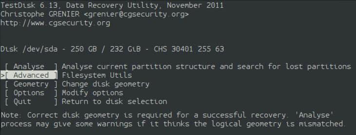 使用 root 权限从终端中打开 TestDisk 可以通过键入 sudo testdisk 命令。