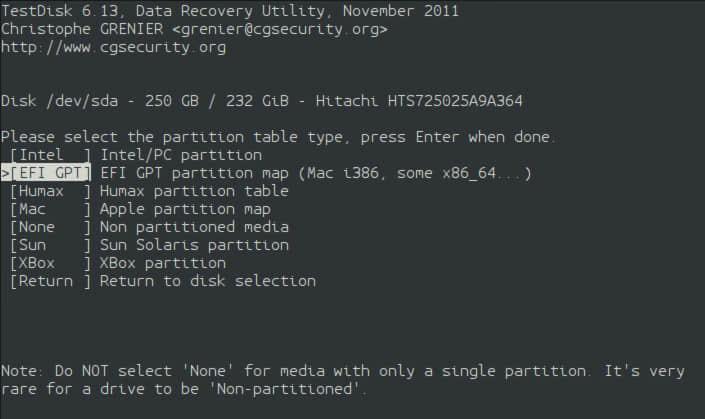 下一屏显示出一个列有分区表(也叫做分区映射表)的清单。正如文件有文件配置表,分区有着分区表。分区是存储设备上的分段。例如在几乎所有的 Linux 系统中,至少存在两种分区类型 - EXT3/4 和 Swap 。每一个分区表将会在下面被简要地描述。TestDisk 并不支持所有类型的分区表,所以这并不是完整的列表。