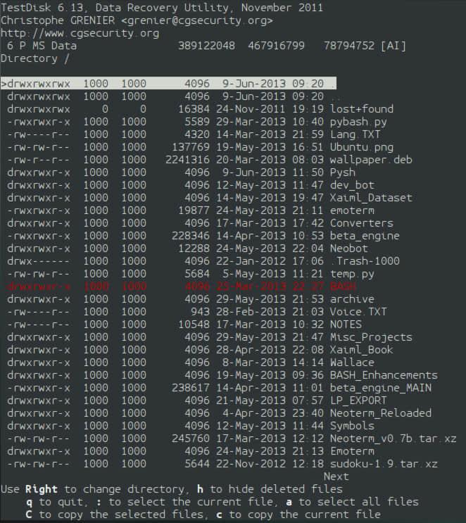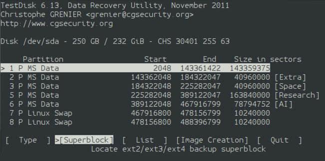 TestDisk 是一个运行在 Linux、 *BSD、 SunOS、 Mac OS X、 DOS 和 Windows 等操作系统下的开源的自由软件。 TestDisk 可以从下面的链接中找到 :http://www.cgsecurity.org/wiki/TestDisk。TestDisk 也可以通过键入 sudo apt-get install testdisk 来安装。TestDisk 有着许多的功能,但这篇文章将只关注恢复文件这个功能。