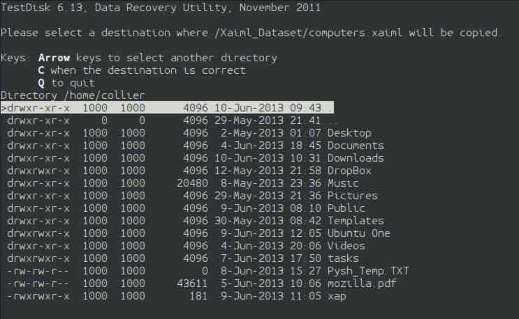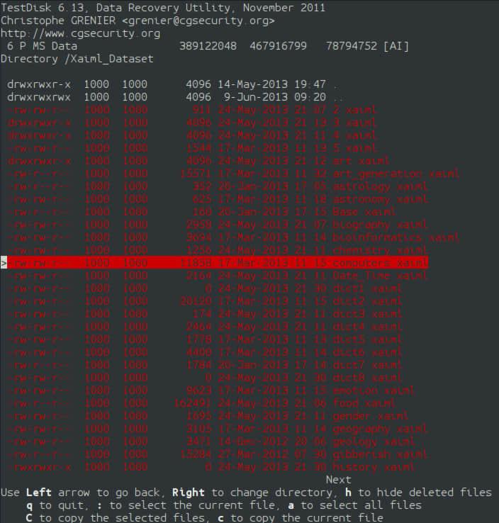 举个例子,我想进入"Xaiml_Dataset" 目录,该目录基本上由被删除的文件组成。通过按键盘上的 "c"键,我将恢复文件 "computers.xaiml",接着我被询问选择一个目标目录,当然,我应该放置该文件到另一个分区中。现在,当我在我的家目录时,按下了“c”键。(选择目标目录时)哪个目录被高亮并没有什么影响,当前目录就是目标目录,在屏幕的上方,将会显示“复制完成”的消息。在我的家目录中便会有一个名为"Xaiml_Dataset"的目录,里面里有一个 Xaiml 文件。 假如我在更多的已删除文件上按“c” 键,则这些文件将会被放置到新的文件夹中而无需再向我询问目标目录。