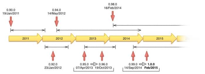 在0.98之后,我们把主干版本命名为0.99-SNAPSHOT,但是我们官方已经用完了所有的数字!欠考虑了,去年 HBase 社区一致认可这个项目已经足够成熟稳定,可以作为1.0.0版本了。在三个0.99.x“开发者预览”系列版本和六个 Apache HBase 1.0.0备选版本之后,HBase 1.0.0现在发布了!看上面的图表,它是由 Lars George 发布的时间表,显示了每个版本的支持周期,及任何开发者预览版本(例如0.99->1.0.0),如果有的话。