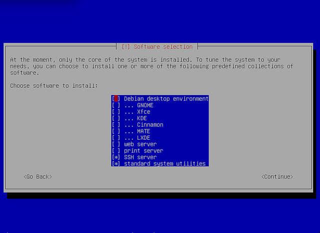 安装一个图形桌面需要安装成百上千的包 —— 这些额外的工作可以稍后再进行。如果你遇到问题了,等待图形桌面的安装会浪费很多时间。同时,没有桌面组件,系统的启动可以更快一些 —— 只需要几十秒而不是几分钟。整个安装过程会需要重启几次,因此这样做可以节省不少时间。