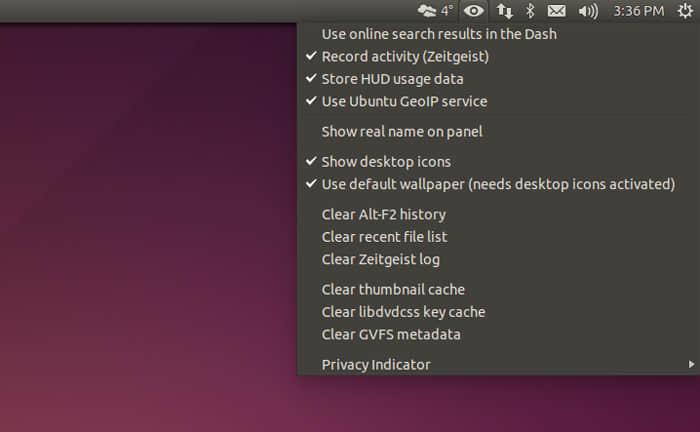 - 开启或关闭在线搜索结果,使用 Zeitgeist 记录系统活动,存储 HUD 使用记录和启用 Ubuntu GeoIP 服务
