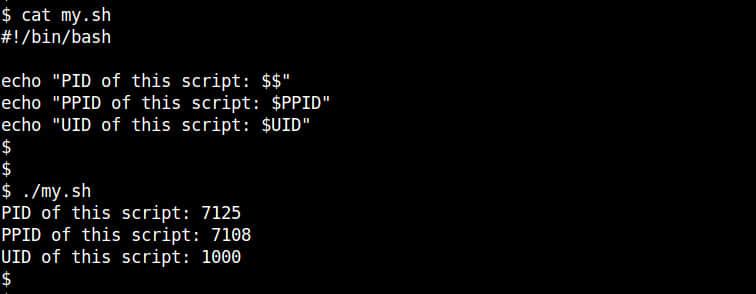 #!/bin/bash echo "PID of this script: $$" echo "PPID of this script: $PPID" echo "UID of this script: $UID"