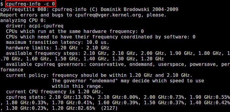 cpufreq-info命令(cpufrequtils包的一部分)从内核/硬件中收集并报告CPU频率信息。这条命令展示了CPU当前运行的硬件频率,包括CPU所允许的最小/最大频率、CPUfreq策略/统计数据等等。来看下CPU #0上的信息: