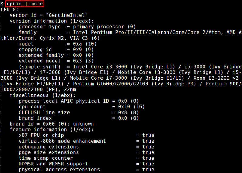 cpuid命令的功能就相当于一个专用的CPU信息工具,它能通过使用CPUID功能来显示详细的关于CPU硬件的信息。信息报告包括处理器类型/家族、CPU扩展指令集、缓存/TLB(译者注:传输后备缓冲器)配置、电源管理功能等等。