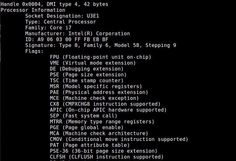 dmidecode命令直接从BIOS的DMI(桌面管理接口)数据收集关于系统硬件的具体信息。CPU信息报告包括CPU供应商、版本、CPU标志寄存器、最大/当前的时钟速度、(启用的)核心总数、L1/L2/L3缓存配置等等。