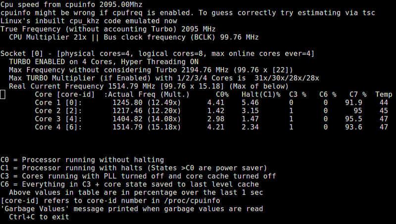 i7z是一个专供英特尔酷睿i3、i5和i7 CPU的实时CPU报告工具。它能实时显示每个核心的各类信息,比如睿频加速状态、CPU频率、CPU电源状态、温度检测等等。i7z运行在基于ncurses的控制台模式或基于QT的GUI的其中之一上。