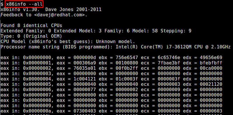 x86info是一个为了展示基于x86架构的CPU信息的命令行工具。信息报告包括CPU型号、线程/核心数、时钟速度、TLB(传输后备缓冲器)缓存配置、支持的特征标志寄存器等等。