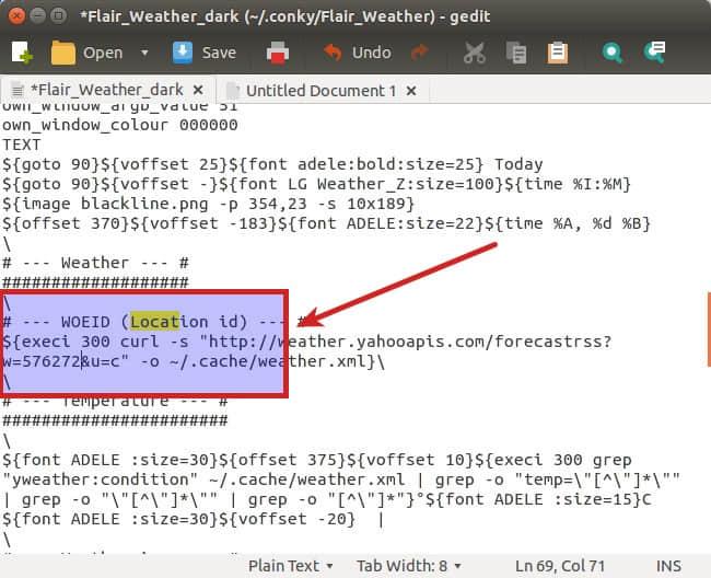 在上面的截图中,你可以看到有一个编辑选定 conky 脚本的选项,在打开的编辑器中,查找 location 或 WOEID ,更换它为你在 步骤 3 中得到的位置 ID 号。然后重启 Conky。