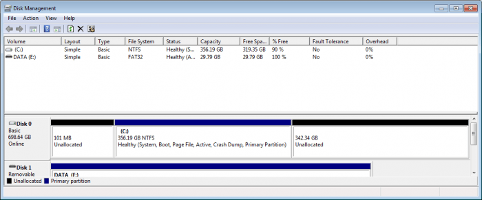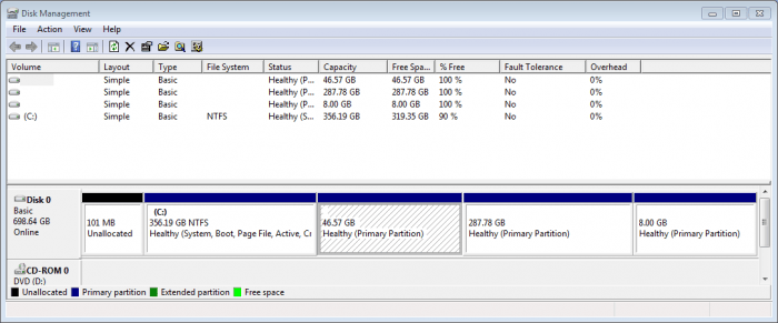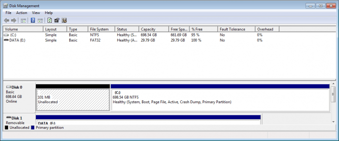 现在上面我的屏幕将不再和你的一模一样了,不过也不会相差太多。你会看到第0块磁盘有101MB的未分配空间,另外还有4个分区。