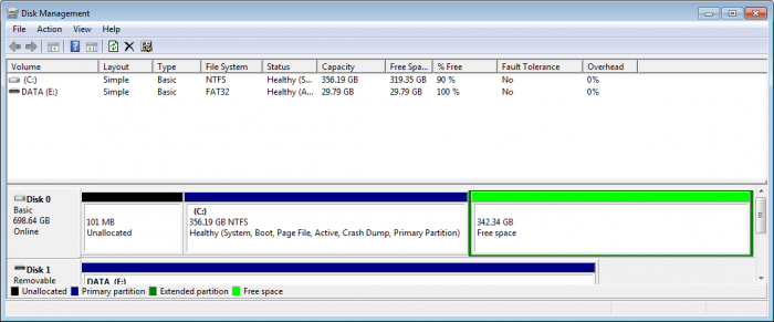 从上图中你可以看到,我的Windows分区占据了整个磁盘(除了我之前安装Windows的时候偶然创建的101MB的空间)。