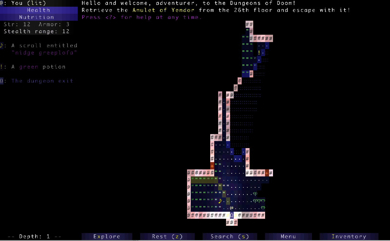 这个游戏的目标是取得深藏于地下第 26 层的 "Amulet of Yendor",再返回到地面逃出生天。对于那些技术娴熟且想进一步探险的人来说,位于 26 层之下的每层均包含 3 颗 lumenstone (流明石)(LCTT 译注:此处与我在这里看到的有些出入),获得它们,将在胜利的基础上被授予额外的得分。