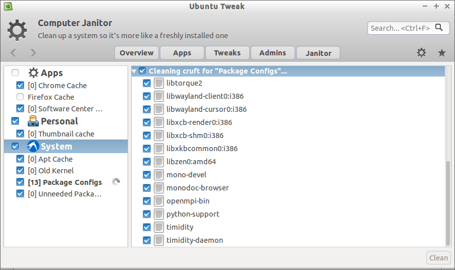 要删除不需要的垃圾文件,打开Ubuntu Tweak,点击 Janitor 选项。