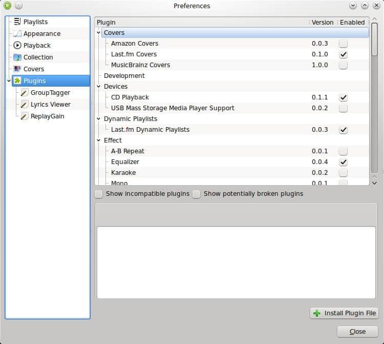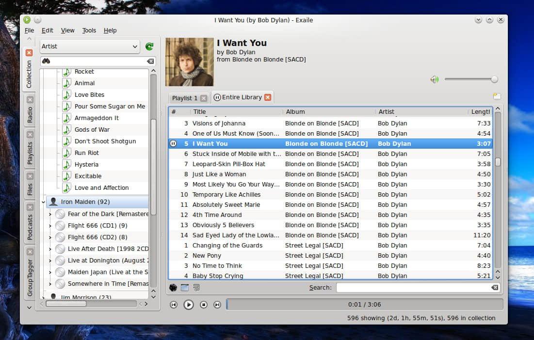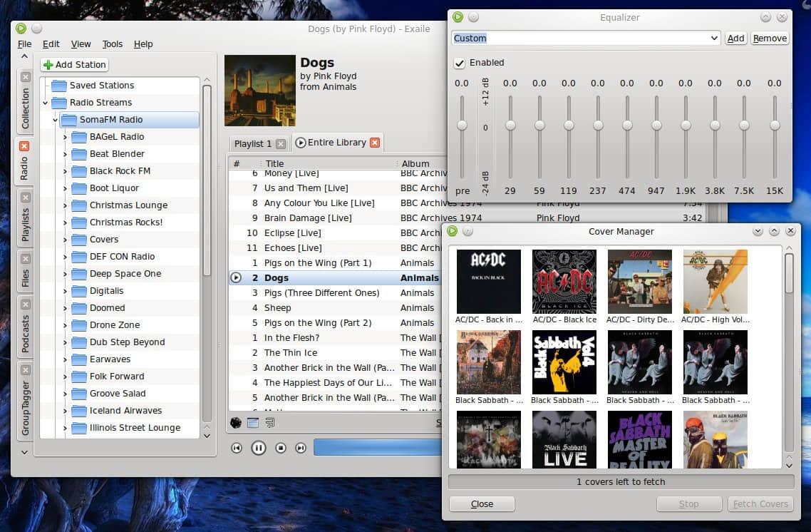 Exaile的功能几乎不尽其数。你可以在音乐集中组织音乐,听播客,对音乐进行评分,编辑标签,查看文件属性,排列歌曲,查看歌曲和封面,按照多种方式排序播放列表,更改播放行为和外观风格。