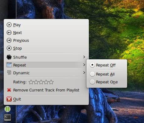 系统托盘集成提供了一个快速播放或者暂停音乐,对音乐评分或者更改音乐列表播放模式(随机,重复或者动态)的菜单。