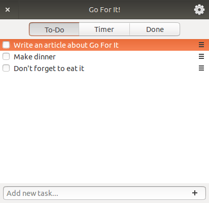 Go For It!是一款简洁的备忘软件,借助定时提醒帮助你专注于工作。所以,当你添加一个任务到列表后,可以附上一个定时器。到设定时间后,它就会提醒你去做任务。你可以看看其帅哥开发者 Manuel Kehl 制作的视频(youtube 视频) : https://www.youtube.com/watch?v=mnw556C9FZQ