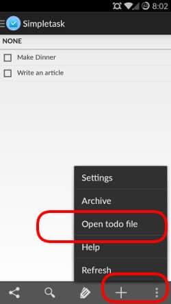 一旦你完成了 Simpletask 与 Dropbox 的关联,就可以打开应用了。如果你已经修改了 Go For It 的配置,将文件保存到Dropbox 上,你就应该可以在 Simpletask 里看到。而如果你没有看到,点击应用底部的设置,选择 Open Todo file 的选项: