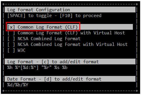 当你第一次启动GoAccess,你将会看到如下的屏幕中选择日期和日志格式。正如前面所述,你可以按空格键进行选择,并按F10确认。至于日期和日志格式,你可能需要参考Apache 文档来刷新你的记忆。