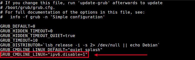 GRUB_CMDLINE_LINUX="xxxxx ipv6.disable=1"