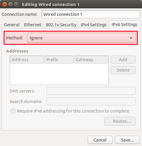 如果你在用NetworkManager来管理你的网络设置,你可以在NetworkManager里禁用IPv6。在NetworkManager打开wired connection,点击"IPv6 Settings"选项并在"Method"一栏选择"Ignore",保存退出。