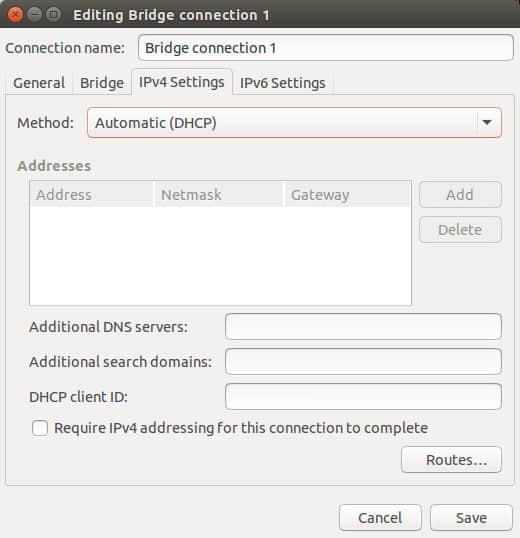 切换到“IPv4 设置”标签,为网桥配置DHCP或者是静态IP地址。注意,你应该为从属的以太网卡接口eth0使用相同的IPv4设定。本例中,我们假设eth0是用过DHCP配置的。因此,此处选择“自动(DHCP)”。如果eth0被指定了一个静态IP地址,那么你也应该指定相同的IP地址给网桥。