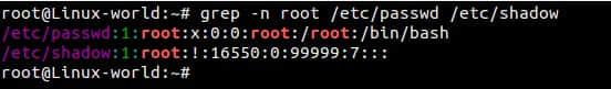 root@Linux-world:~# grep -n root /etc/passwd /etc/shadow