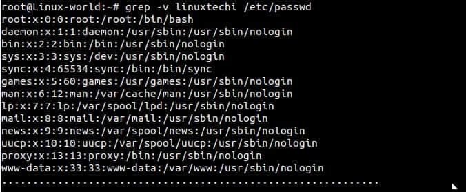 root@Linux-world:~# grep -v linuxtechi /etc/passwd